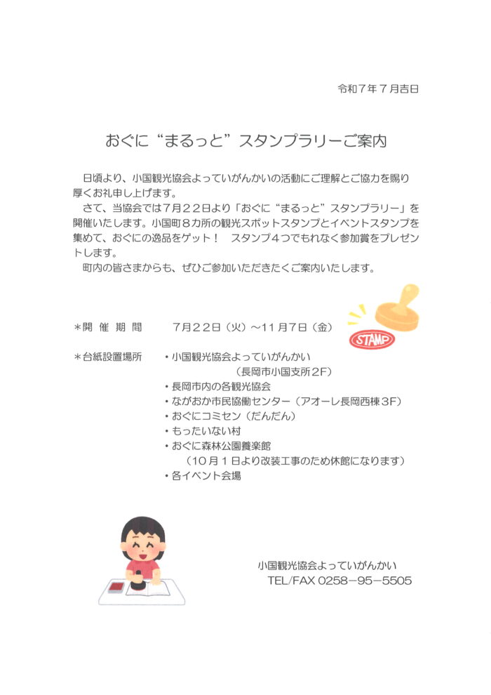 お知らせ7月22日よりおぐに“まるっと”スタンプラリーが始まりました。町内8カ所の観光スポットに設置してあるスタンプを集めておぐにの逸品をゲット!